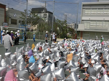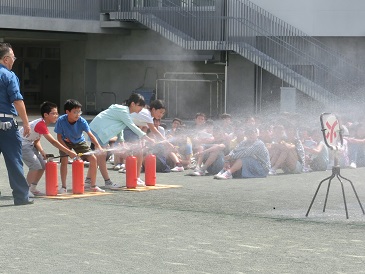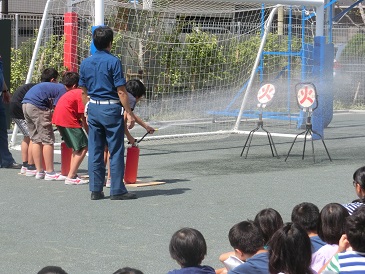 避難後はみんなで消火器の使い方を教わり、6年生は実際に消火器を握って消火訓練を行いました。
