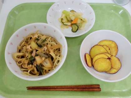 献立 みそラーメン、野菜の中華サラダ、さつま芋チップス、牛乳