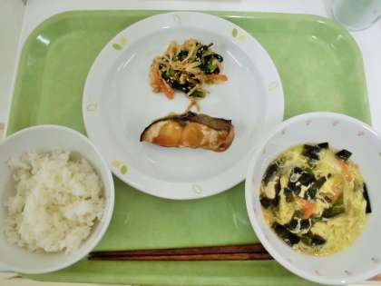 献立 ご飯、めだいの甘酢あんかけ、野菜のごまじょうゆ和え、卵とわかめのスープ、牛乳