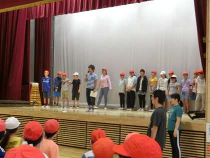 集会委員さんが「ポパイさんの言う通り」というゲームを企画してくれました。司会者が「ポパイさんが言いました。○○してください」と言ったときだけ、司会者の言う通りに行動します。