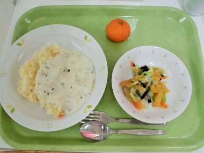 献立 チキンクリームライス、パリパリサラダ、冷凍みかん、牛乳