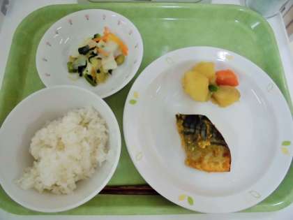 献立 ご飯、さばのタンドリー風、じゃが芋の炒め煮、青大豆入りゆで野菜、牛乳
