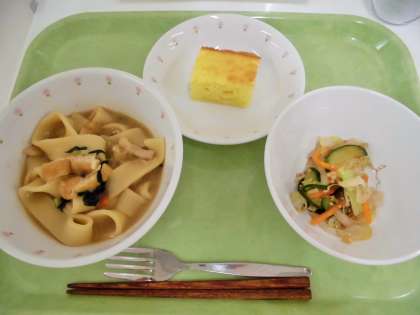 献立 おっきりこみうどん、こんにゃくサラダ、りんごケーキ、牛乳