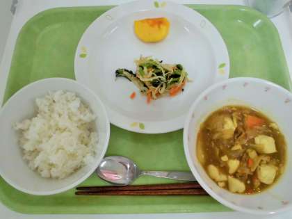 献立 ご飯、豆腐のカレー煮、三色ナムル、柿、牛乳