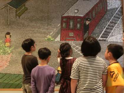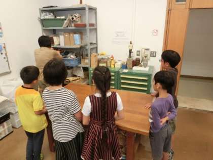 鑑賞教室では展覧会の他にも、館内の体験施設や区民ギャラリー、屋外展示など美術館のすべてを、ボランティアの鑑賞リーダーさんに案内していただきました。