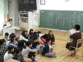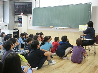 今回は高学年のみんなに、お母さんたちが選んだ本を読り、子どもたちはみんな膝を抱えて静かに聞き入っていました。