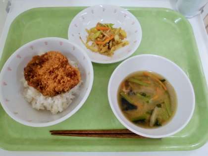 献立 たれかつ丼、白菜のおかか和え、五目みそ汁、牛乳