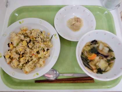 献立 高菜チャーハン、豆腐入りしゅうまい、白菜スープ、牛乳