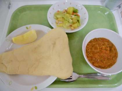 献立 ナン、キーマカレー、大豆とポテトのサラダ、りんご、牛乳