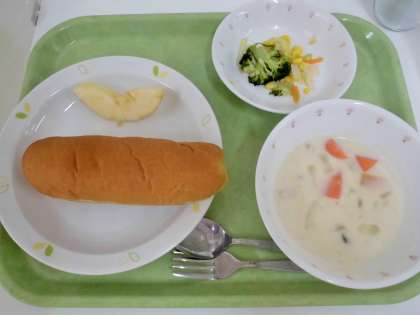 献立 あしたばパン、さつま芋のクリームシチュー、ブロッコリーサラダ、洋梨、牛乳