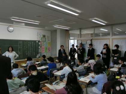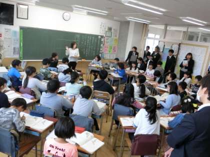 本校では国語の「読むこと」の指導を通して「深い学びにつながる授業づくり」を研究しています。今日は5年生の教室で「大造じいさんとガン」を教材に、研究授業が行われました。