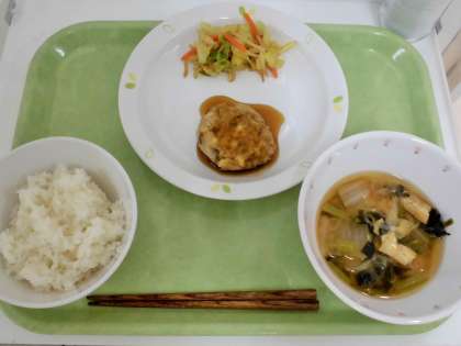 献立 ご飯、れんこんのつくね焼き、キャベツのお浸し、冬野菜のみそ汁、牛乳
