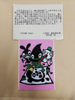 10/6にペナントに絵を描き、11月いっぱいくらいに下北沢一番街商店街一帯に飾られていました。今日は、絵を描くときにご指導いただいたTSUTOMU NAGAI先生から、記念のポストカードをいただきました。