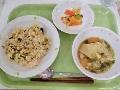 献立 野沢菜チャーハン、大根ときゅうりのピリ辛和え、わんたんスープ、牛乳