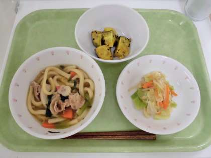 献立 肉うどん、こんにゃくサラダ、大学芋、牛乳