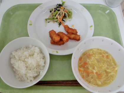 献立 ご飯、いかのチリソース、野菜のごま酢和え、卵とコーンの中華風スープ、牛乳