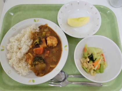献立 冬野菜カレーライス、大豆入りゆで野菜、りんご、牛乳