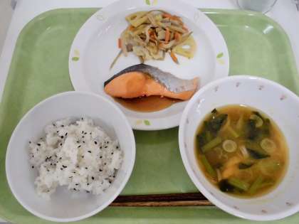 献立 ごまご飯、鮭のゆうあん焼き、れんこんの塩きんぴら、かぼちゃのみそ汁、牛乳