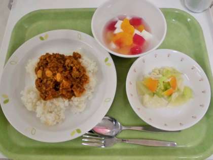 献立 大豆入りドライカレーライス、キャベツサラダ、紅白ポンチ、牛乳