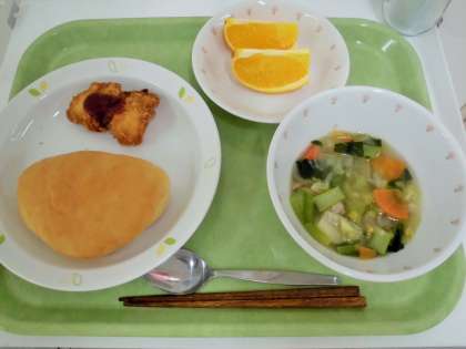 献立 フィッシュフライサンド、スコッチブロス、ネーブルオレンジ、牛乳