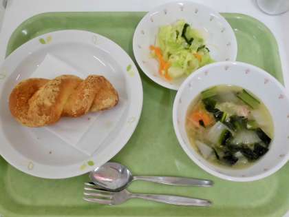 献立 きなこ揚げパン、野菜と肉団子のスープ、ポテト入りフレンチサラダ、牛乳
