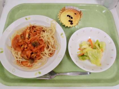 献立 ツナとしめじのスパゲッティ、野菜のドレッシングかけ、チョコチップマフィン、牛乳