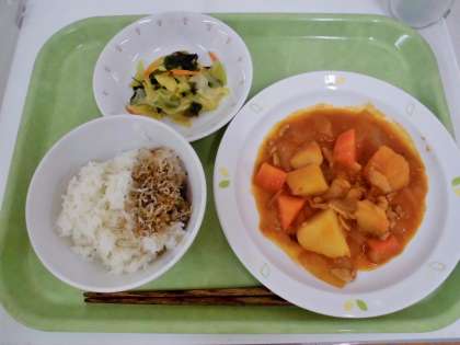 献立 ご飯、じゃこふりかけ、トマト肉じゃが、わかめサラダ、牛乳