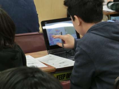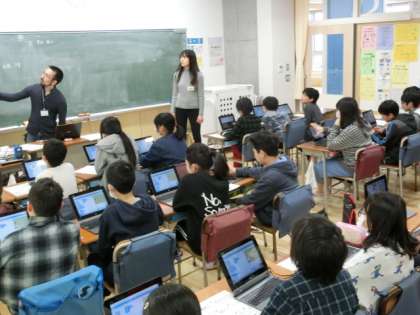 地域の方の協力のもと、「Scratch」というソフトを使ってプログラム入力の考え方を体験しました。