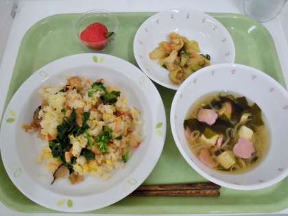 献立 菜の花ちらしずし、みそドレッシングサラダ、豆腐とわかめのすまし汁、いちご、牛乳