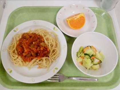 献立 ミートソーススパゲッティ、ポテト入りフレンチサラダ、せとか、牛乳