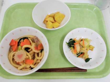 献立 きつねうどん、白菜のだしじょうゆ和え、キャラメルポテト、牛乳