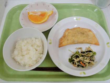 献立 ご飯、ジャンボぎょうざ、じゃこ入りナムル、デコポン、牛乳