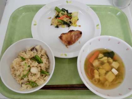 献立 たいめし、鶏肉の照り焼き、小松菜のごま和え、えのきのすまし汁、牛乳