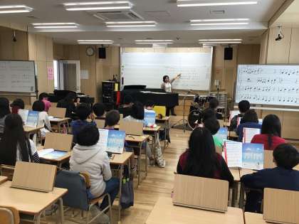 音楽の時間です。先生のすてきな歌声を真剣に聞いています。