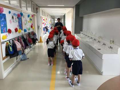 これから校庭で体育です。廊下での整列も日に日に上手になっています。