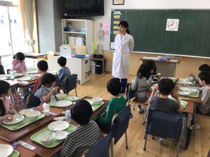 給食の時間には、栄養士の先生が各クラスをまわって、給食指導をしています。