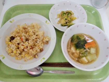 献立 チャーハン、白菜の中華サラダ、チンゲン菜とコーンのスープ、牛乳
