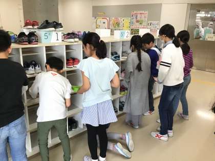 協力してていねいにそうじをしています。下駄箱がとてもきれいになりました。