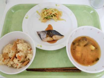 献立 たけのこご飯、さわらの甘辛だれ、アスパラ入りごま和え、豆腐とわかめのみそ汁、牛乳