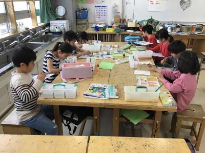 図工の時間です。絵の具を混ぜて、自分だけの好きな色を作っています。