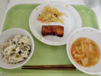 献立 グリンピースご飯、いかのかりんとう揚げ、こんにゃくサラダ、かぶのみそ汁、牛乳
