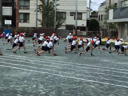 体育の時間です。準備運動のあと、50メートル走のタイムを計ります。