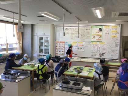 6年生が三色野菜炒めに挑戦しています。人参やキャベツを上手に切ることができるでしょうか。