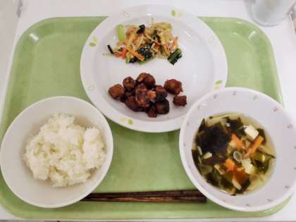 献立 ご飯、かつおの竜田揚げ、野菜のごまだれかけ、若竹汁、牛乳