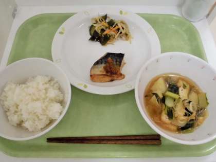 献立 ご飯、さばのねぎソースかけ、もやしとわかめのごまじょうゆ和え、じゃが芋のみそ汁、牛乳