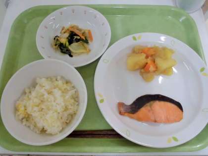 献立 元気ご飯、鮭の塩こうじ焼き、じゃが芋の炒め煮、野菜のなめたけ和え、牛乳