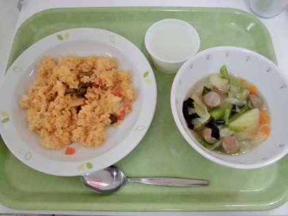 献立 チキンライス、ウインナーと野菜のスープ煮、ホワイトゼリー、牛乳