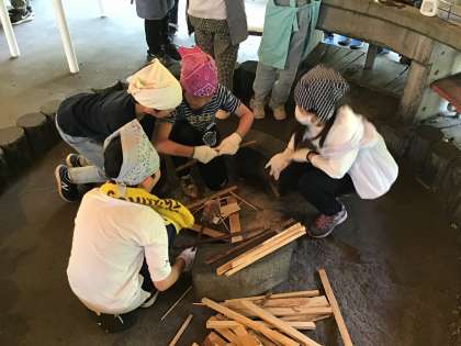 どうしたらうまく火がつくか。相談しながら作業を進めています。