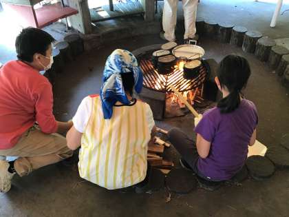 カレーの鍋も火にかかり出しました。チームワークの良さが光ります。