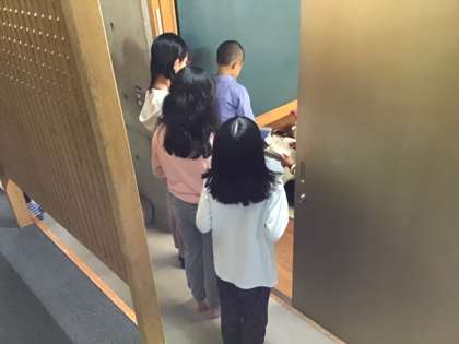 就寝時刻15分前。保健係のみなさんが、看護師さんに健康カードを届けています。